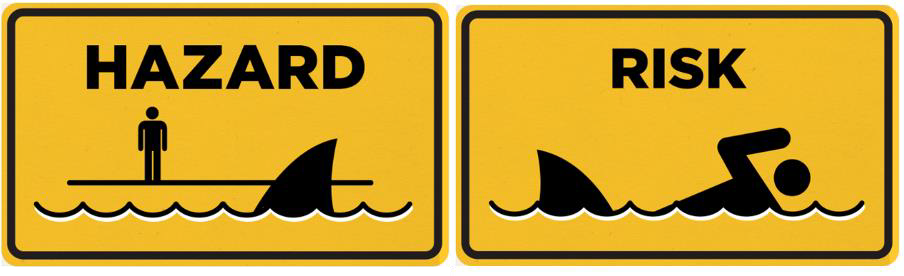 Figuur 2. Risico = gevaar x blootstelling. Een haai is intrinsiek gevaarlijk, maar zonder blootstelling is er geen risico. Dit principe wordt breed toegepast, maar bij een belangrijk onderdeel van de toelatingsprocedure van gewasbeschermings-middelen wordt aleen gekken naar het intrinsieke gevaar.