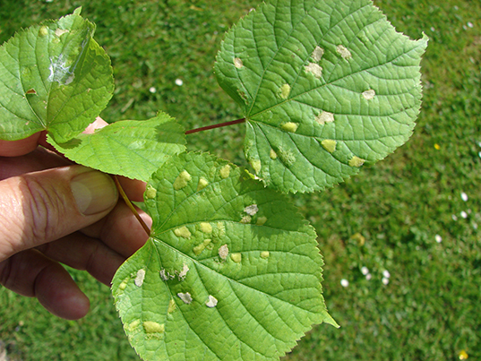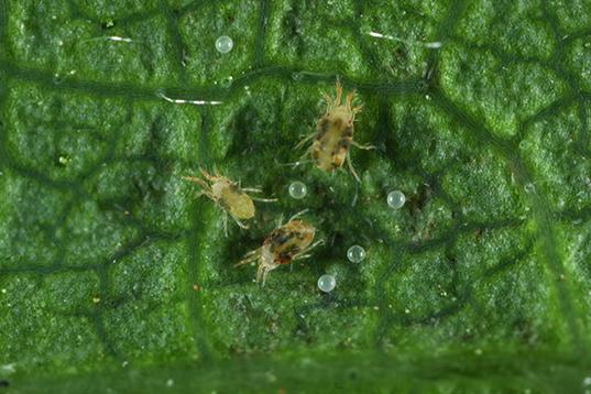 Bonenspintmijt (Tetranychus urticae) bevindt zich vooral aan de onderkant van het blad. Ze prikken cellen aan en zuigen die leeg. De lege cellen kleuren geel. Aan de bovenkant van het blad zijn kleine puntjes te zien. Ernstig aangetast blad wordt geel en sterft af.
