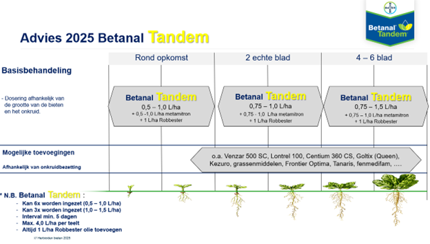 - Betanal Tandem wordt gecombineerd met metamitron en plantaardige olie (bijvoorbeeld 1 l/ha Robbester of 1 l/ha Actirob B) om de onkruidbestrijding te versterken;
