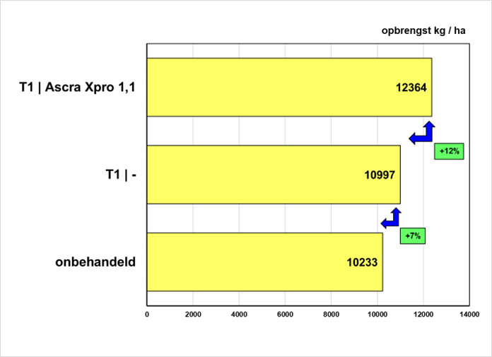 In deze proevenserie, met hoge opbrengsten in onbehandeld, zien we dat gemiddeld een T2 bespuiting 12% extra meeropbrengst geeft t.o.v. alleen een T1 bespuiting. Ook hier waren de omstandigheden zeer verschillend.