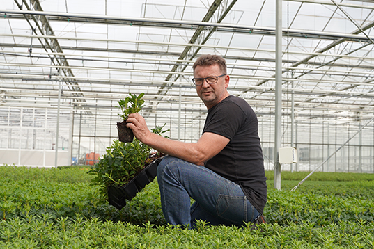 'We moeten planten niet béter maken, maar weerbaarder maken'. Raymond Haarman herhaalt deze zin een aantal keren tijdens het gesprek. En ook de volgende zin gaat meermaals over tafel: 'We moeten als kwekers minder met ziektebestrijding en meer met gewasgezondheid bezig zijn.' Het is duidelijk dat het thema plantweerbaarheid de boomkweker volop bezighoudt. ,,Ik denk dat deze omslag in denken bij mij een jaar of tien geleden is ingezet. Door een slimmer samenspel van klimaatbeheersing, bemesting en preventieve biologische gewasbescherming kunnen we planten sterker maken en minder afhankelijk van curatieve chemische middelen. Bovendien zijn we met deze aanpak toekomstbestendiger. Onze afnemers – en ook zijn klanten – willen dat we steeds meer vergroenen in onze gewasbescherming'', zegt hij tijdens een ronde door de kassen.